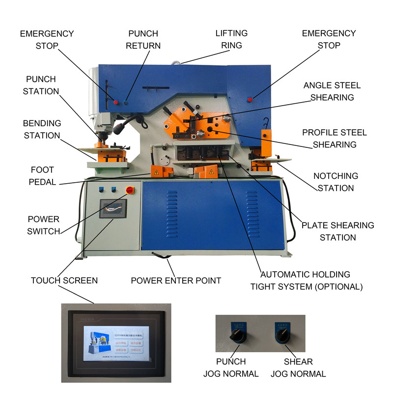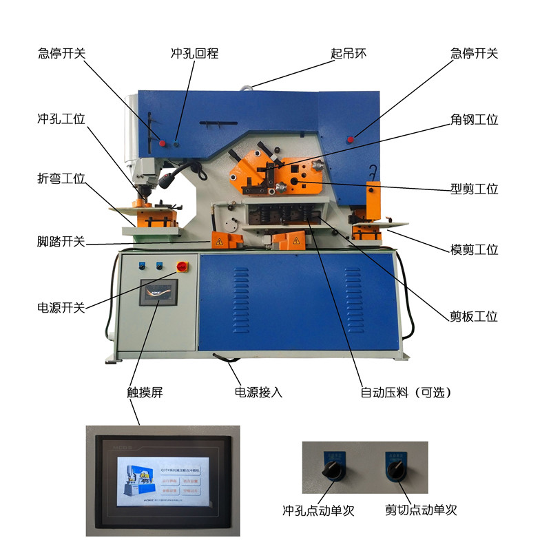 奧克Q35Y系列液壓聯(lián)合沖剪機,采用獨有的高速液壓系統(tǒng),極大程度的提高您的加工效率,幫您節(jié)省成本。配合我們歷時2年為聯(lián)合沖剪機打造的智能故障識別系統(tǒng),“PCB+工業(yè)級智能芯片”使得我們的沖剪機邁入智造的行列。在確保安全第一的前提下,機器可以對板材、方鋼、圓鋼、角鋼、槽鋼、工字鋼進(jìn)行高效的剪切、沖孔、模剪或者折彎。